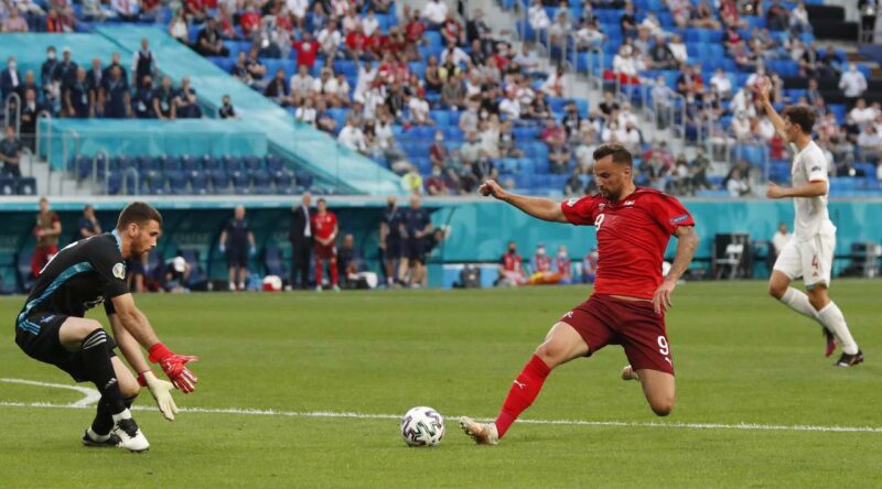 Po ilgosios pertraukos kamuolio kontrolė ir toliau priklausė ispanams, tačiau 56-ąją minutę nuostabaus šanso pasižymėti neišnaudojo Denisas Zakaria, kurio smūgiuotas kamuolys praskriejo labai arti virpsto. Dar po 12 minučių ispanai savo aikštės pusėje grubiai suklydo, o kamuolį perėmęs Remo Freuleris atliko perdavimą Xherdanui Shaqiri, kuris tiksliu smūgiu nuginklavo vartininką ir išlygino rezultatą 1:1.