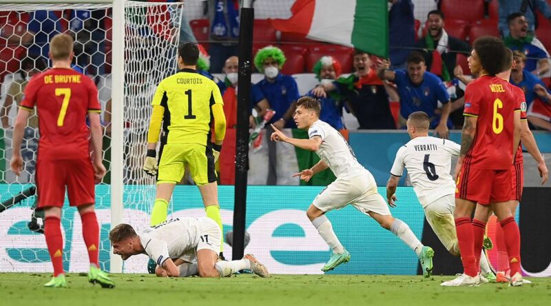 31-ąją minutę Marco Veratti perėmė kamuolį belgų aikštės pusėje ir atliko perdavimą Nicolo Barellai, kuris nuostabiu smūgiu pasiuntė kamuolį į tolimąjį vartų kampą bei išvedė italus į priekį 1:0. Neilgai trukus italai surengė keletą pavojingų atakų bei 44-ąją minutę Lorenzo Insigne dar kartą nuginklavo Thibautą Courtoisą bei rezultatas tapo 2:0 italų naudai.