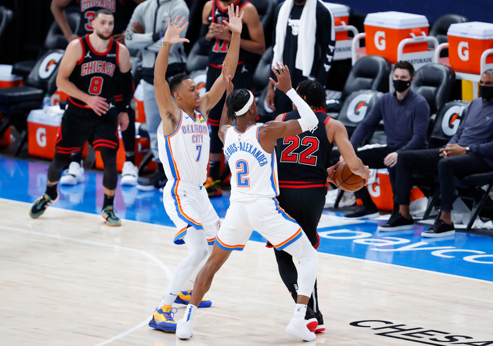 Iki ketvirtojo kėlinio pabaigos likus 1min 58sek. Billy Donovano auklėtiniai pirmavo rezultatu 118:108. Visai netrukus Oklahomos „Thunder ekipa surengė įspūdingą spurtą ir rezultatas tapo beveik lygus – 115:118. Likus žaisti 49,7 sekundės, komandos apsikeitė netaikliais metimais, tačiau jau kitoje „Thunder“ ekipos atakoje Gilgeous Alexanderis pelnė 2 taškus su pražanga ir išlygino rezultatą – 118:118. „Bulls“ lemiamai atakai dar turėjo 16,4 sekundės ir Donovanas paprašė minutės pertraukėlės. Vis tik Zacho LaVine‘o tritaškis skrido pro šalį ir veiksmas persikėlė į pratęsimą.