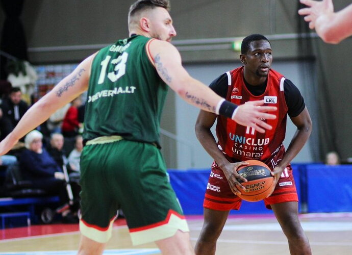 Mačą energingiau pradėjo namų komanda (7:2), tačiau Jalonas Pipkinsas, iš pradžių nepataikęs kelių metimų, įsibėgėjo ir sumažino atsilikimą – 9:12. Po trumpos pertraukėlės dėmesį į save atkreipė Karolis Giedraitis, bet šeimininkai neleido perimti iniciatyvos – 15:16. Kėlinio pabaigoje svečiams pritrūko jėgų – Lukas Uleckas kartu su Pauliumi Valinsku surengė įspūdingą ataką ir uteniškiai pabėgo į priekį – 27:19.